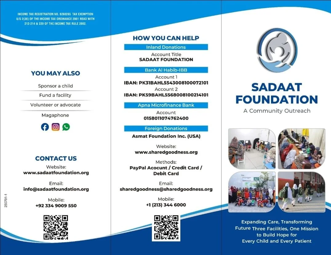 “Sadaat Foundation and Asmat Foundation have joined hands to uplift communities through compassion-driven initiatives focused on health, education, and social welfare — working together for a brighter, healthier future for all.”